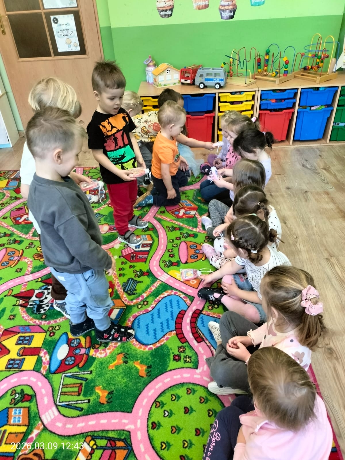9.03.2026r. Dzień Kobiet w naszym przedszkolu był wyjątkowym i pełnym radości wydarzeniem. Tego dnia wszystkie dziewczynki czuły się szczególnie ważne i docenione. Chłopcy z ogromnym zaangażowaniem składali koleżankom serdeczne życzenia, wręczali drobne upominki oraz własnoręcznie przygotowane laurki.