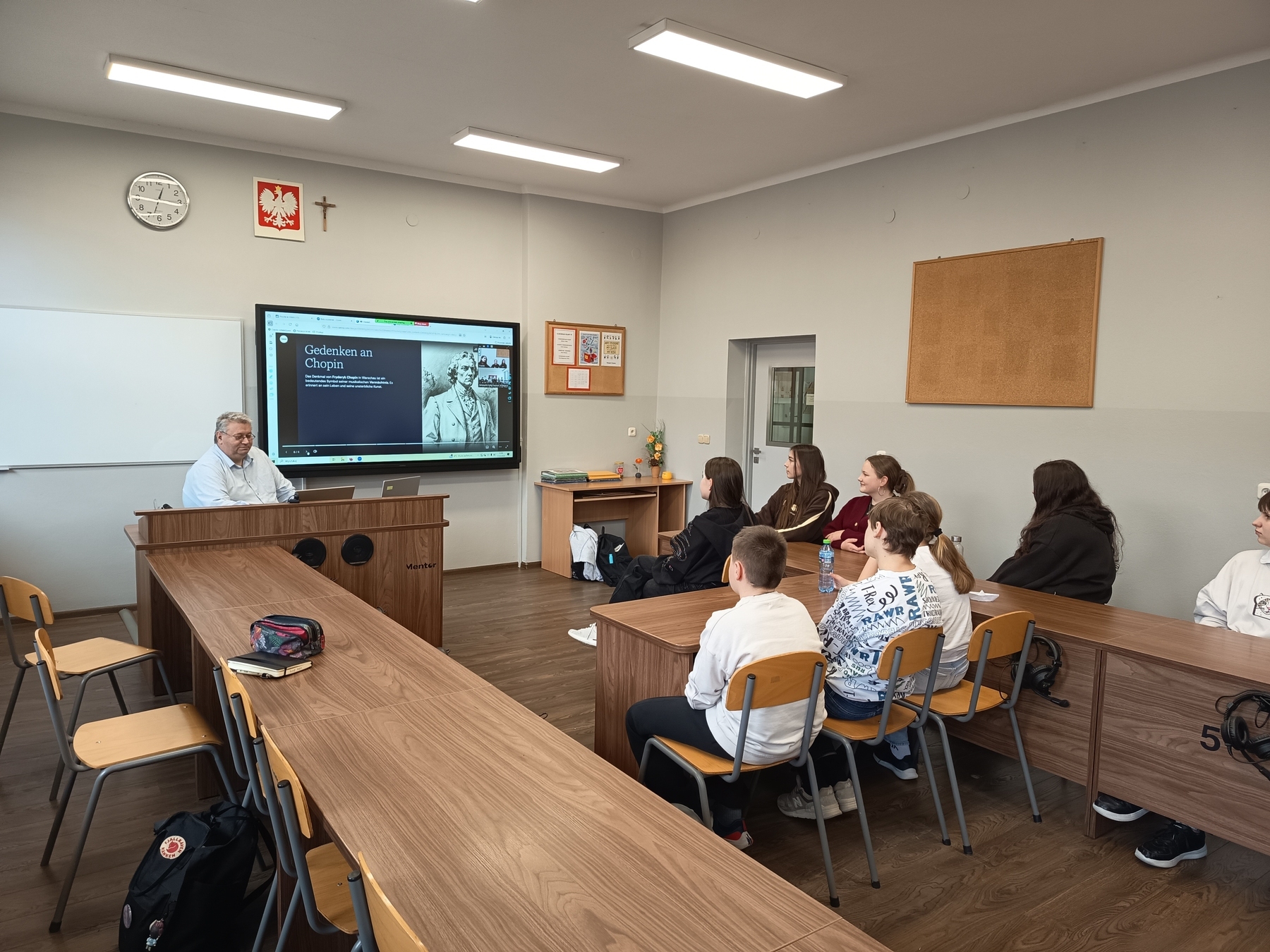 i Polski. Nasi uczniowie przygotowali prezentację w programie Canva oraz przybliżyli sylwetkę twórczą Fryderyka Chopina. Było to kolejne spotkanie utrzymane w swobodnej i koleżeńskiej atmosferze. Cieszymy się, że już trzy lata trwa nasza międzynarodowa współpraca.